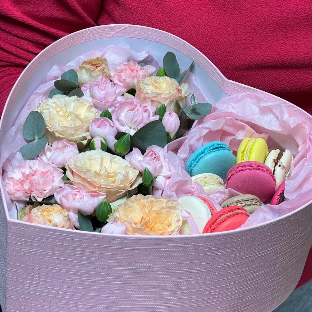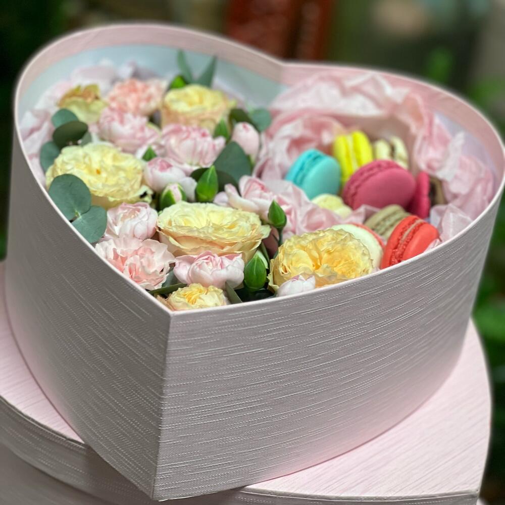 “Сладкое сердце ” – цветочная композиция с сладостями в коробке “Сердце”