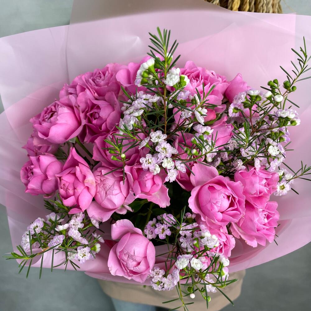 Ваксфлауэр – 2 шт.Роза пионовидная кустовая – 5 шт.Упаковка дизайнерская – 1 шт.