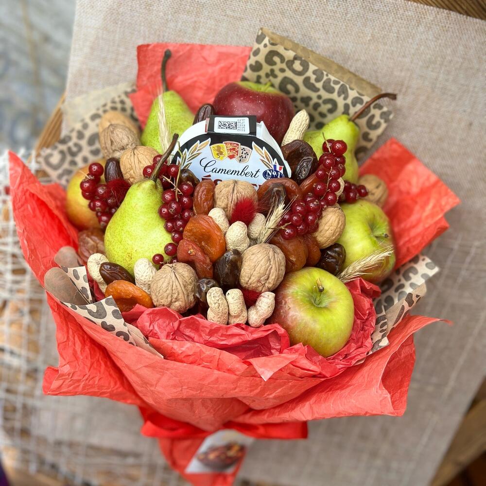 яблоки красные – 5 шт.груши – 3 шт.сыр камамбер – 1 шт.Курага – 100 гр.Финики – 150 гр.грецкие орехи в скорлупе – 200 гр.арахис в скорлупе – 30 гр.Сухоцветы – 5 шт.